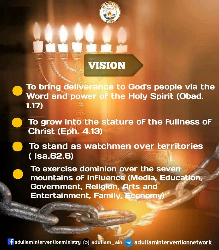 ADULLAM INTERVENTION MINISTRY is a non-denominational ministry mandated by God to raise generals in God's kingdom...